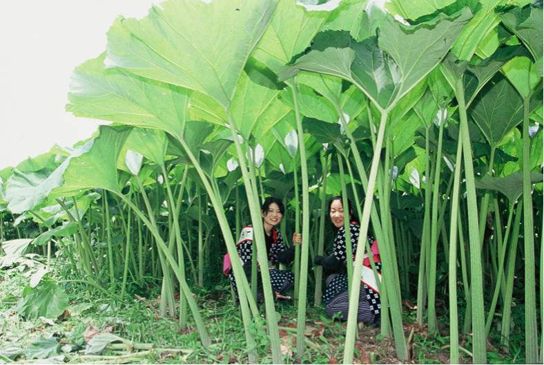 サトイモの一種で葉柄(ずいき)と親芋を食する。畑栽培と水を張った苗代栽培のもの、青茎と赤茎がある。