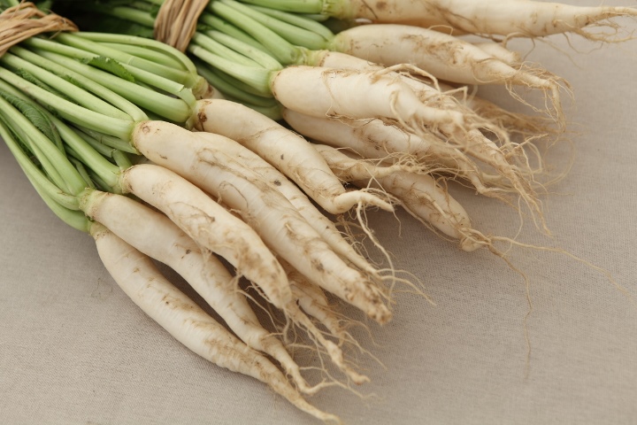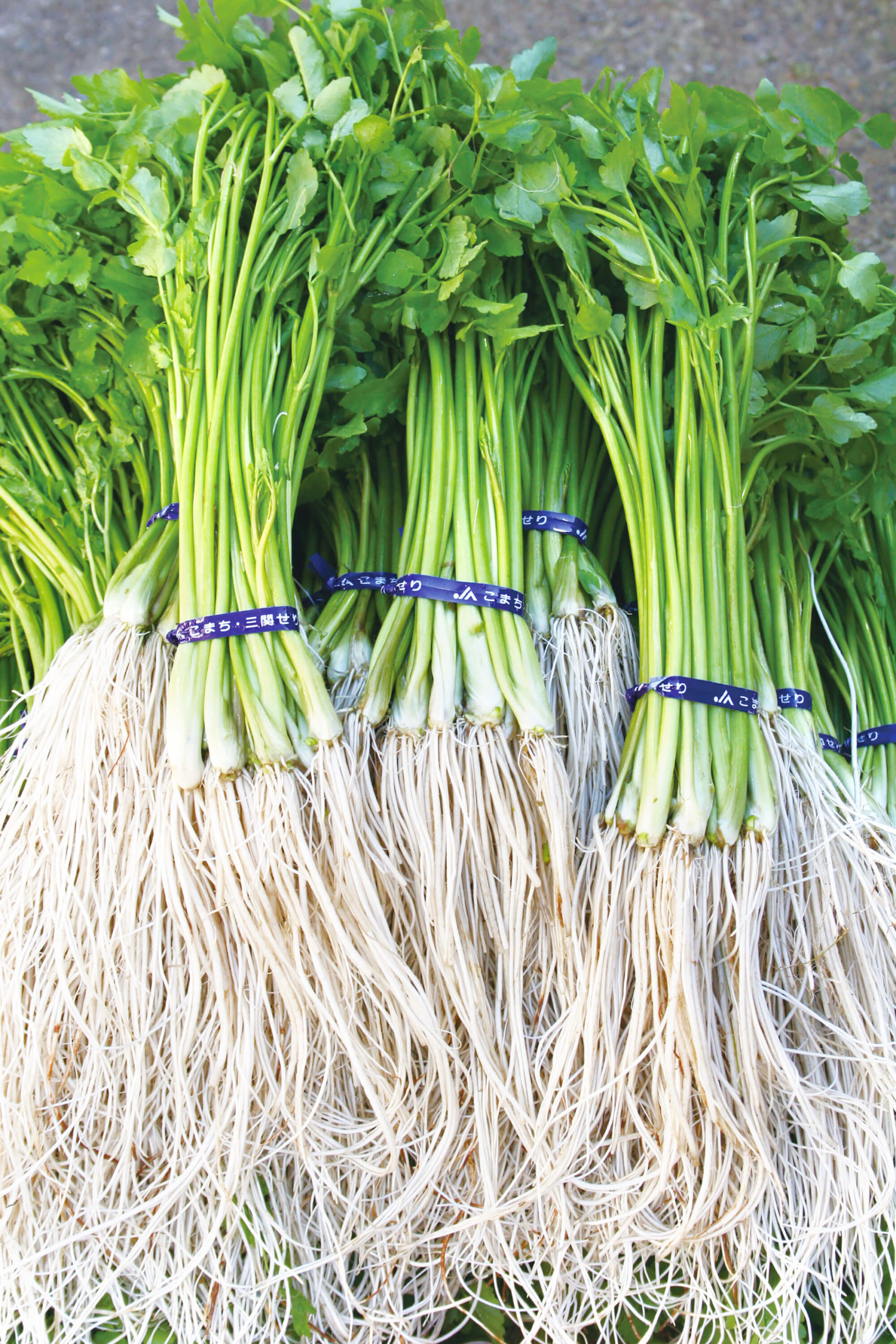 一番の特徴は白く長い根。寒冷地の三関ではセリがゆっくり成長するため、寒くなると葉茎より根が伸びる。