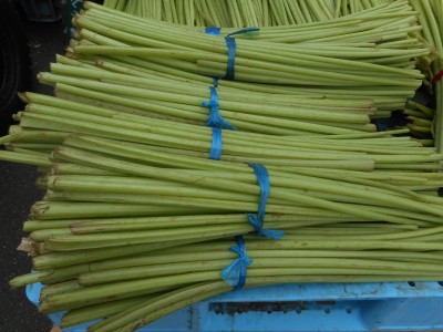 大型のふき。茎が1.3~2mくらいと長く、直径も3~6cmほどと極太。葉も1~1.5mくらいの幅があり、傘のように大きいのが特徴。日本一大きなふき。