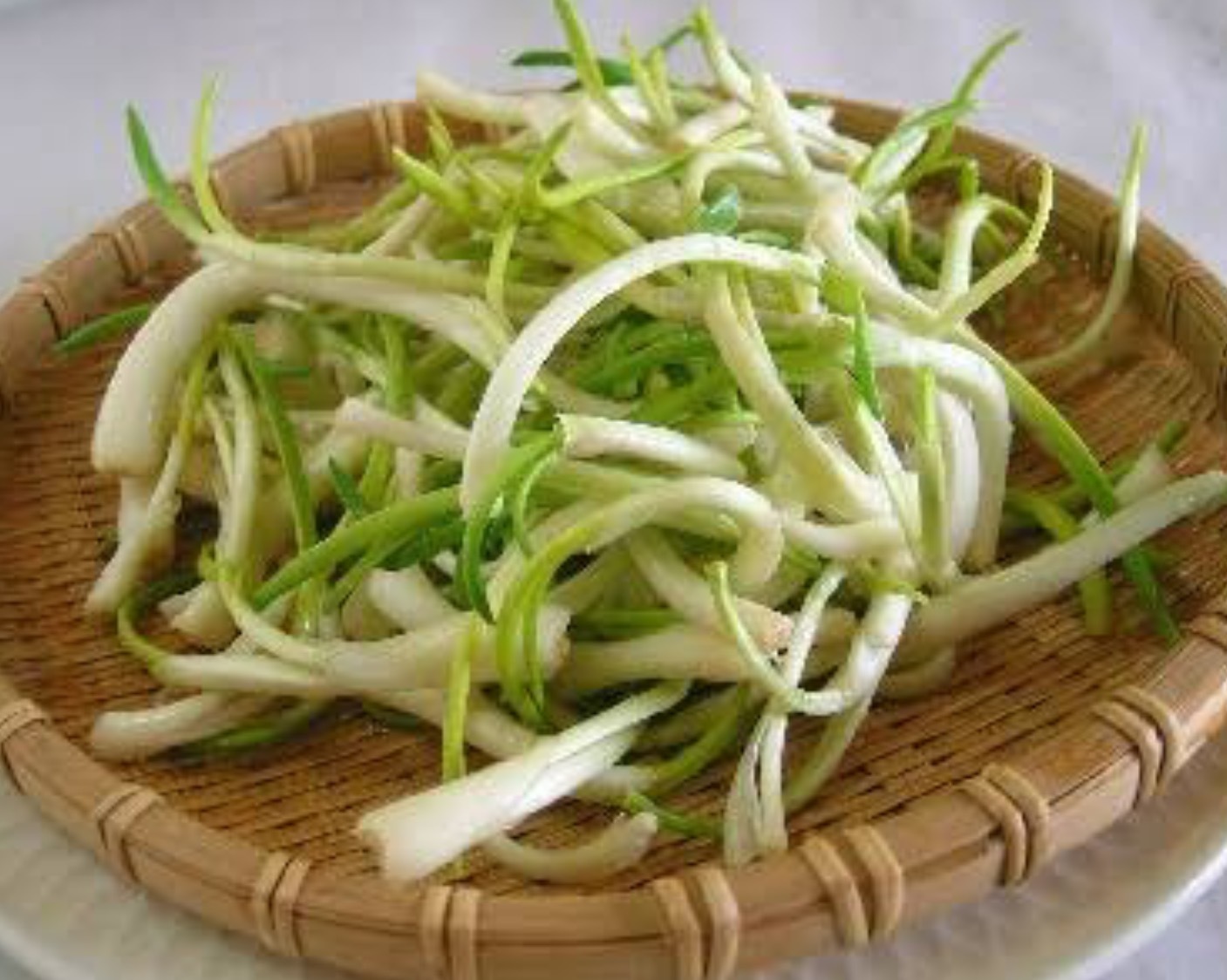 アサツキの若芽。9月ごろ植え付けし、12月の積雪後から収穫を始める。