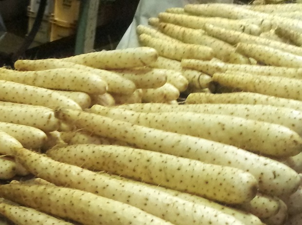 長芋の一種。首が短く肉づきが良く、色白で粘りが強くアクが少ないのが特徴。サクサクとした歯ごたえがある。水分が多く、粘りは少ない。