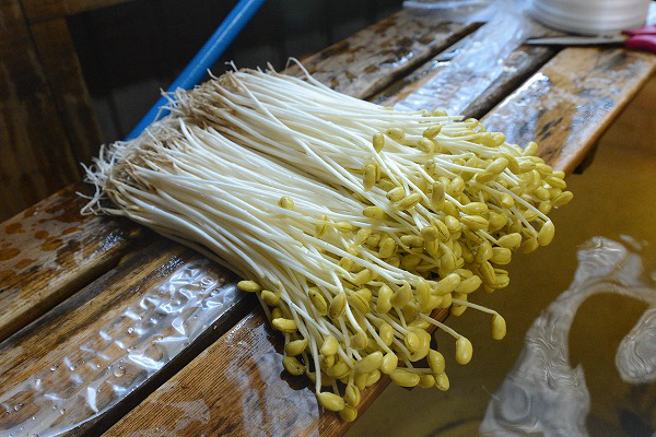 江戸時代からのこの栽培方法を行っており、土の畑に「沢」と呼ばれる穴を掘って種を蒔き、ワラで光をさえぎって1週間。温泉の熱で土の温度は常に30℃程度に保ち、発芽したもやしは、40センチほどにまで成長する。現在の大鰐温泉もやしの生産者は6軒。