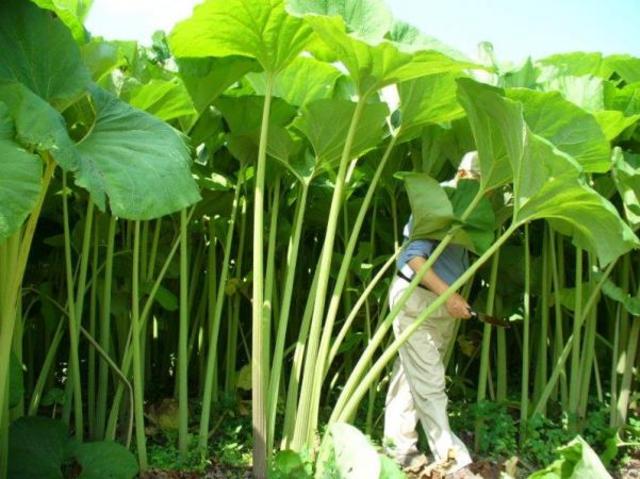 大きくなると高さ3m、太さが10cm以上に育つ日本一大きなフキ。さまざまな複合的要因により足寄町でのみ大きく育っていると考えられている。